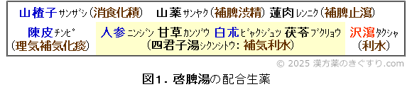本方は、啓脾湯の四君子湯(図3の黄色枠内の4生薬)と山薬、蓮肉を含みます。