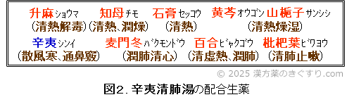 辛夷清肺湯の配合生薬は、辛夷以外は赤字の清熱性の生薬です。清肺に関わるのは、辛夷と図2下段右側の3生薬と、上段5種の清熱薬です。