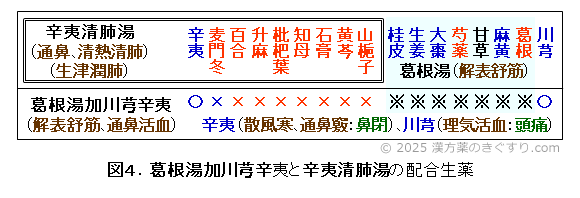 3.1)葛根湯加川芎辛夷(カッコントウカセンキュウシンイ)は、かぜ初期に用いられる葛根湯(図4下段の※を付した7生薬)に、頭痛を軽減する川芎(センキュウ)と鼻閉を軽減する辛夷を加味した方剤です。漢方薬名の意味:葛根湯加川芎辛夷を参照してください。