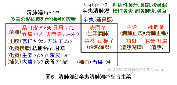 3.3)清肺湯(セイハイトウ)の方剤名は、辛夷清肺湯に類似していますが、図6に示すように共通生薬は多くありません。