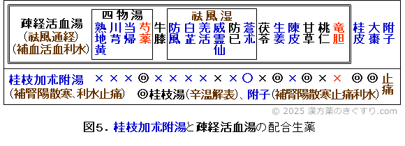 本方は、体力低下者(軽度の気血両虚 キケツリョウキョ)に用いられる桂枝湯(ケイシトウ)に、祛風湿・利水健脾薬の蒼朮と散寒止痛薬の附子(ブシ)を加味した方剤です(図5)。冷えと痛みの顕著な痺証(寒痺 カンピや痛痺 ツウヒ)に適します。