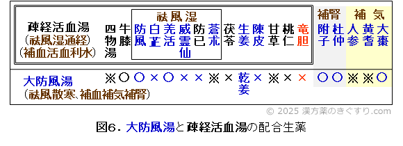 4.2)大防風湯(ダイボウフウトウ)は、栄養不良や筋肉の減少を補う補気補血剤の十全大補湯の8生薬(図6の※印)を含みます。さらに冷え、足腰の衰えや痛みを軽減する補腎薬(ホジンヤク)の附子、杜仲(トチュウ)牛膝を含みます。