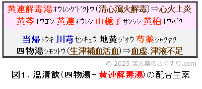 本方は、温の機能を担う四物湯(シモツトウ:図1下段の4生薬)と、清の機能を担う黄連解毒湯(オウレンゲドクトウ:図1上段の4生薬)の合剤です。黄連解毒湯の配合比率が四物湯より少なめになっています。