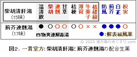 3.1)柴胡清肝湯(サイコセイカントウ:15味)と荊芥連翹湯(ケイガイレンギョウトウ:17味)は、温清飲を含む四物黄連解毒湯(図2の灰色枠内の11生薬)を含みます。