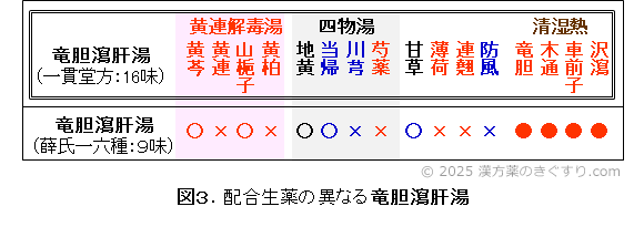 なお本方には配合生薬の異なる9味の製剤があります(図3)。適応は、共に泌尿器・生殖器の炎症症状です。漢方薬名の意味:竜胆瀉肝湯を参照してください。