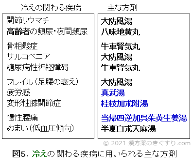 この「病気の悩みを漢方で」では疾病の背景にある冷えを探索し、散寒薬や温補薬を含む方剤を紹介しています(図5)。冷えの悩みは女性に多いですが男性にも発現します。