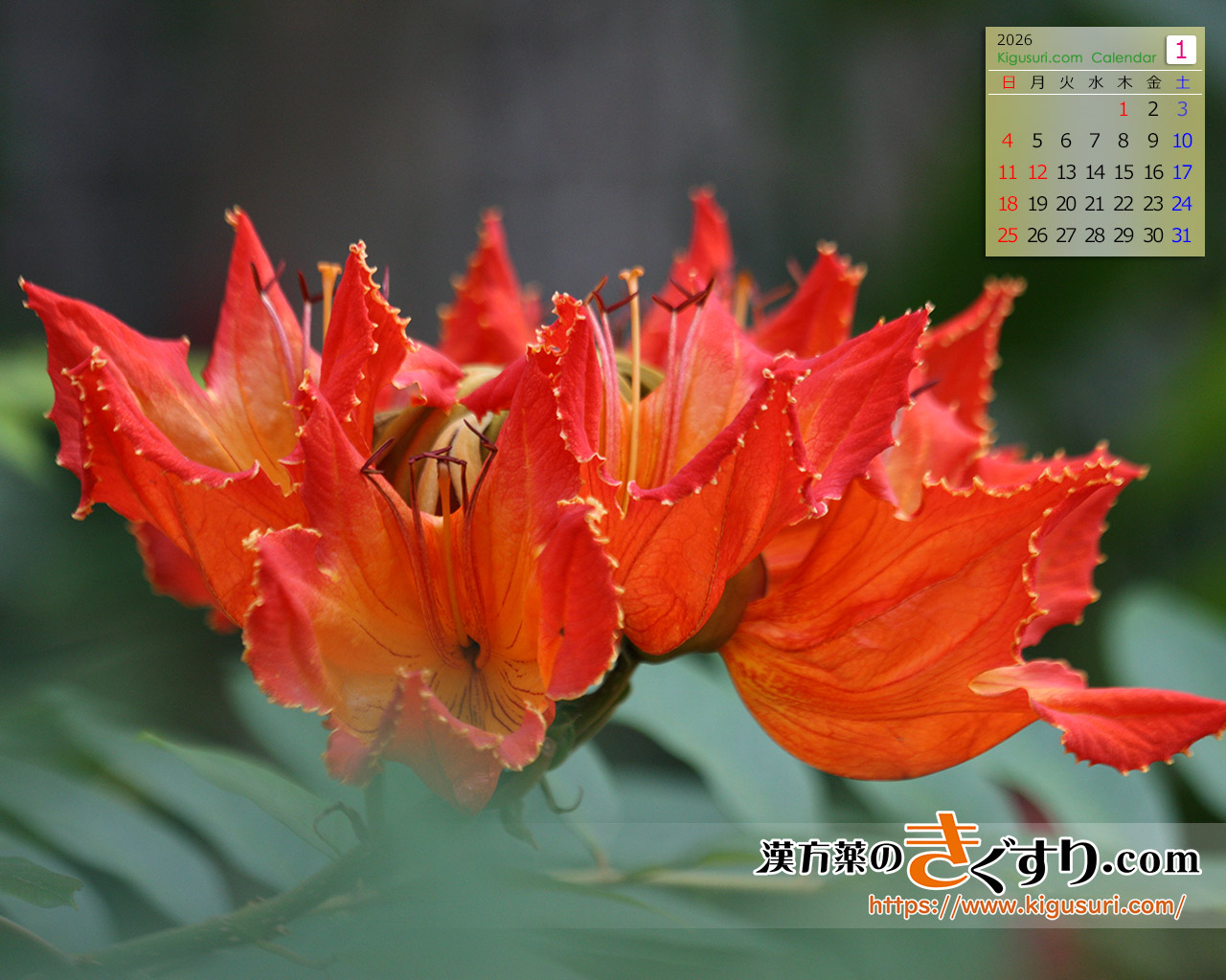 パソコンのデスクトップの壁紙を美しい植物で飾りませんか? 「漢方薬のきぐすり.com」では、月替りで「壁紙カレンダー」をお届けします。 ご家庭で、職場でご使用下さい。