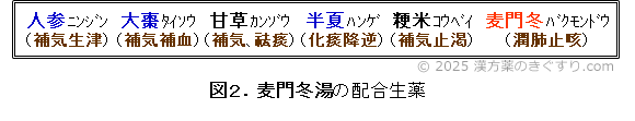 本方には、麦門冬以外にも乾燥を潤す粳米(コウベイ:玄米)と人参と大棗が含まれています(図2)。