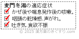 麦門冬湯は、乾燥病態を背景にした感冒の亜急性期や気管支喘息発作後の乾性咳嗽、声がれ、咳き込みに用いられています。