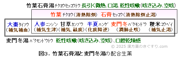 3.1)竹葉石膏湯(チクヨウセッコウトウ)は、麦門冬湯の5生薬に清熱薬の竹葉(チクヨウ)と石膏(セッコウ)を加味した方剤です(図3)。