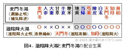3.2)滋陰降火湯(ジインコウカトウ)は、麦門冬に加えて、乾燥を潤す地黄(ジオウ)、津液不足(シンエキフソク)による虚熱(キョネツ)を冷ます天門冬(テンモンドウ)知母(チモ)を含む滋陰降火止咳剤(ジインコウカシガイザイ)です。