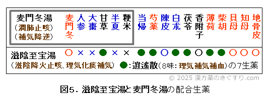 3.3)滋陰至宝湯(ジインシホウトウ)は、麦門冬に加えて、柴胡(サイコ)を含む理気剤の逍遙散(ショウヨウサン)の生姜以外の7生薬(図5の●を付した7生薬)と理気薬の香附子(コウブシ)を含む方剤です。