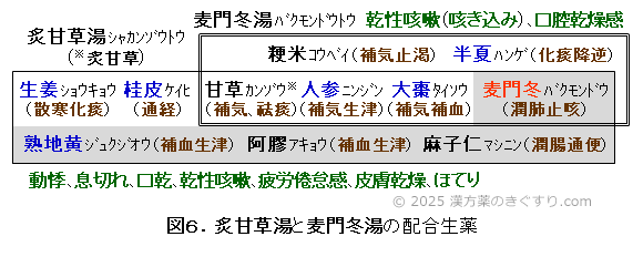 3.4)炙甘草湯(シャカンゾウトウ)は、麦門冬以外に熟地黄(ジュクジオウ)などの生津薬(セイシンヤク:図6の灰色枠内の4生薬)を含む補気補血生津剤です(図6)。
