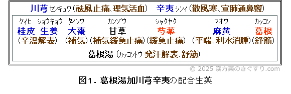 葛根湯加川芎辛夷の名は、葛根湯(図1下段の7生薬)に川芎(センキュウ)と辛夷(シンイ)を加味した方剤であることを示しています。