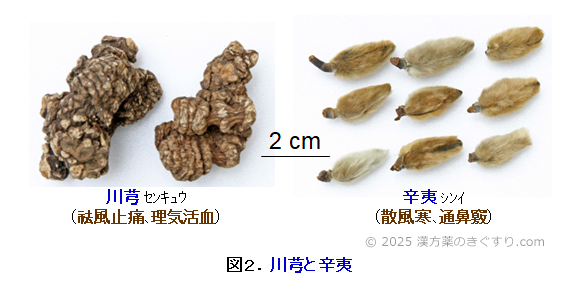川芎(図2)は、風邪(フウジャ)を発散させて痛みを軽減する祛風止痛薬(キョフウシツウヤク)であり、気血(キケツ)を巡らせて頭痛を軽減する理気活血薬(リキカッケツヤク)でもあります。頭痛を軽減する重要な生薬の一つです。