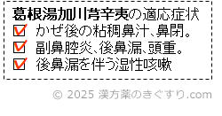 ・鼻炎、副鼻腔炎の粘稠鼻汁、鼻づまり、頭痛に用いる。葛根湯よりやや慢性期に良い。膿性鼻汁には葛根湯加桔梗石膏が適する(三谷和合)。