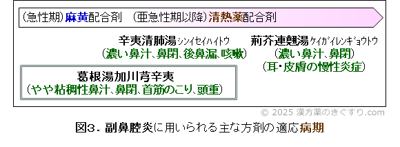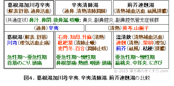 葛根湯加川芎辛夷は、急性期から亜急性期、辛夷清肺湯と荊芥連翹湯は、亜急性期から慢性期の熱証傾向の鼻炎、副鼻腔炎に用いられます。