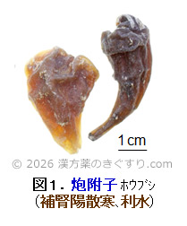 玄武湯の名は、玄武⇒黒色⇒腎なので補腎陽散寒薬(ホジンヨウサンカンヤク)の附子(ブシ:図1)を含む方剤名とされました。