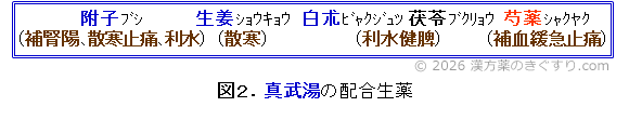 真武湯は、附子と散寒薬の生姜と、利水健脾薬(リスイケンピヤク)の白朮(ビャクジュツ)茯苓(ブクリョウ)を含む補腎陽・補脾・利水剤(ホジンヨウホヒリスイザイ)です(図2)。補血薬(ホケツヤク)の芍薬(シャクヤク)は、過剰な利水による乾燥を防ぎます。