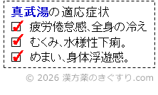 真武湯の適応は、新陳代謝の低下(腎陽虚)による冷えと全身倦怠感と、めまい・浮遊感、むくみ(水滞)を伴う病態です。冷えると悪化する症状に適します。気温の低い早朝の水様性下痢(虚寒性の鶏鳴下痢)が特徴です。