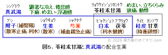 本方は、気逆の発作性の頭痛、動悸を鎮める桂皮と甘草との薬対(降衝鎮悸)を含みます(図5)。この両生薬が本方と真武湯との相違点です。
