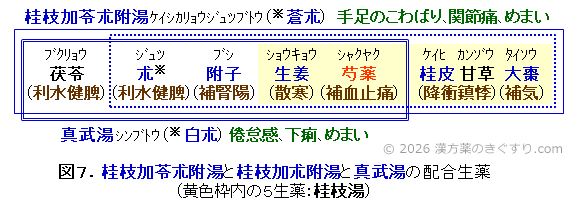 4.3)桂枝加苓朮附湯(ケイシカリョウジュツブトウ)は、桂枝加朮附湯(ケイシカジュツブトウ:図7の点線で囲んだ7生薬)に茯苓(ブクリョウ)を加味した方剤です。