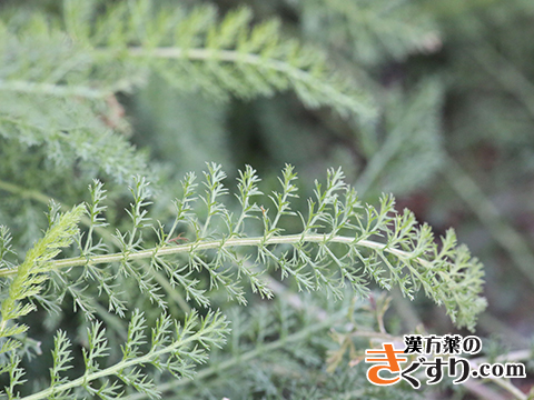 2回羽状複葉で深裂した葉は互生し、ノコギリのように見え、種名のmillefolium(「細かく切れた葉」の意味)の名前の由来になっています。