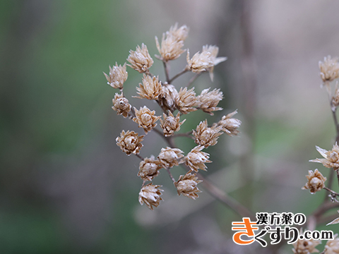 夏の7月から9月頃、茎頂に白色又は淡紅色の小さな頭状花を散房状に付けます。それぞれの頭状花は5個位の舌状花と多数の筒状花からなっています。